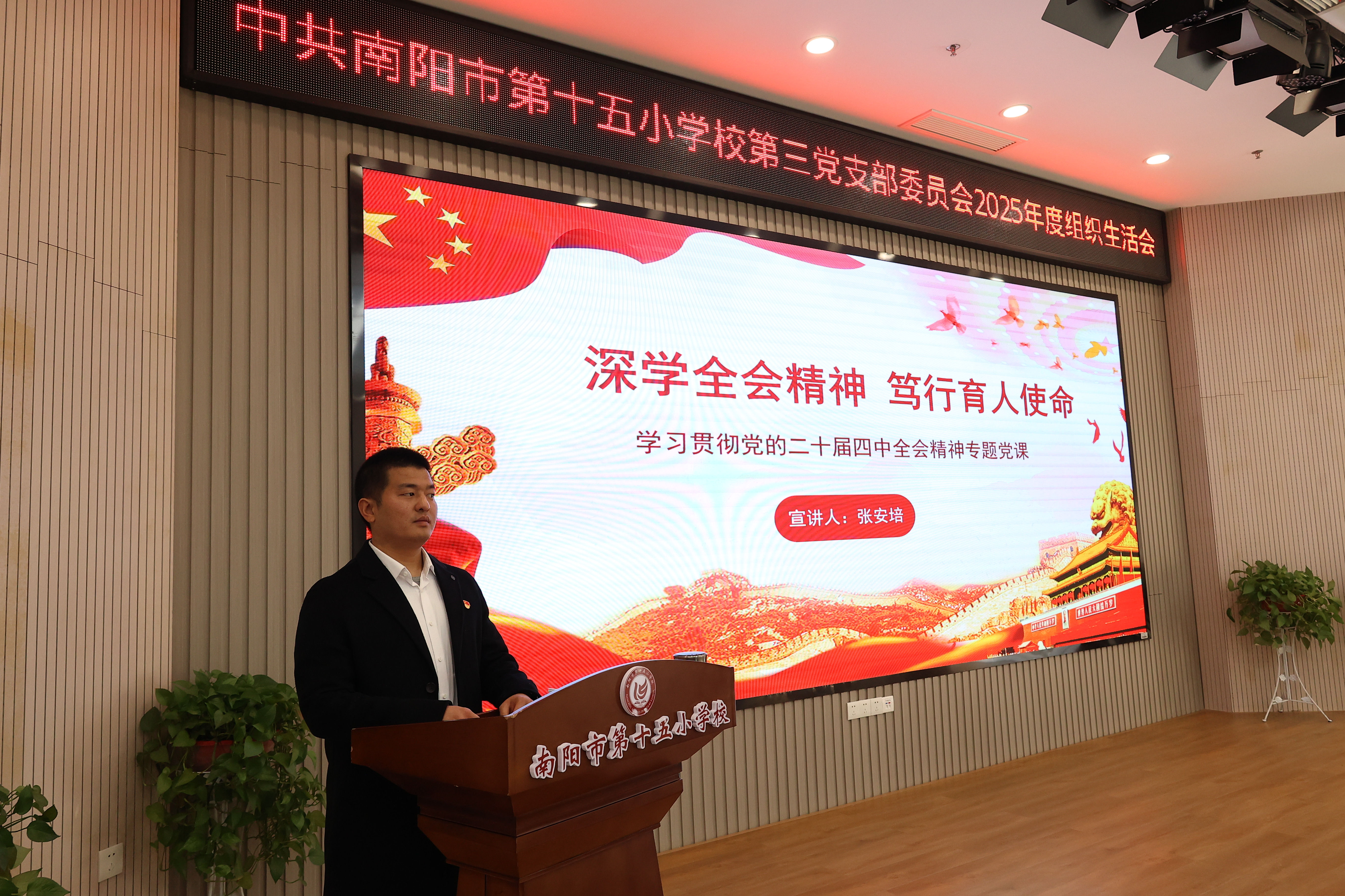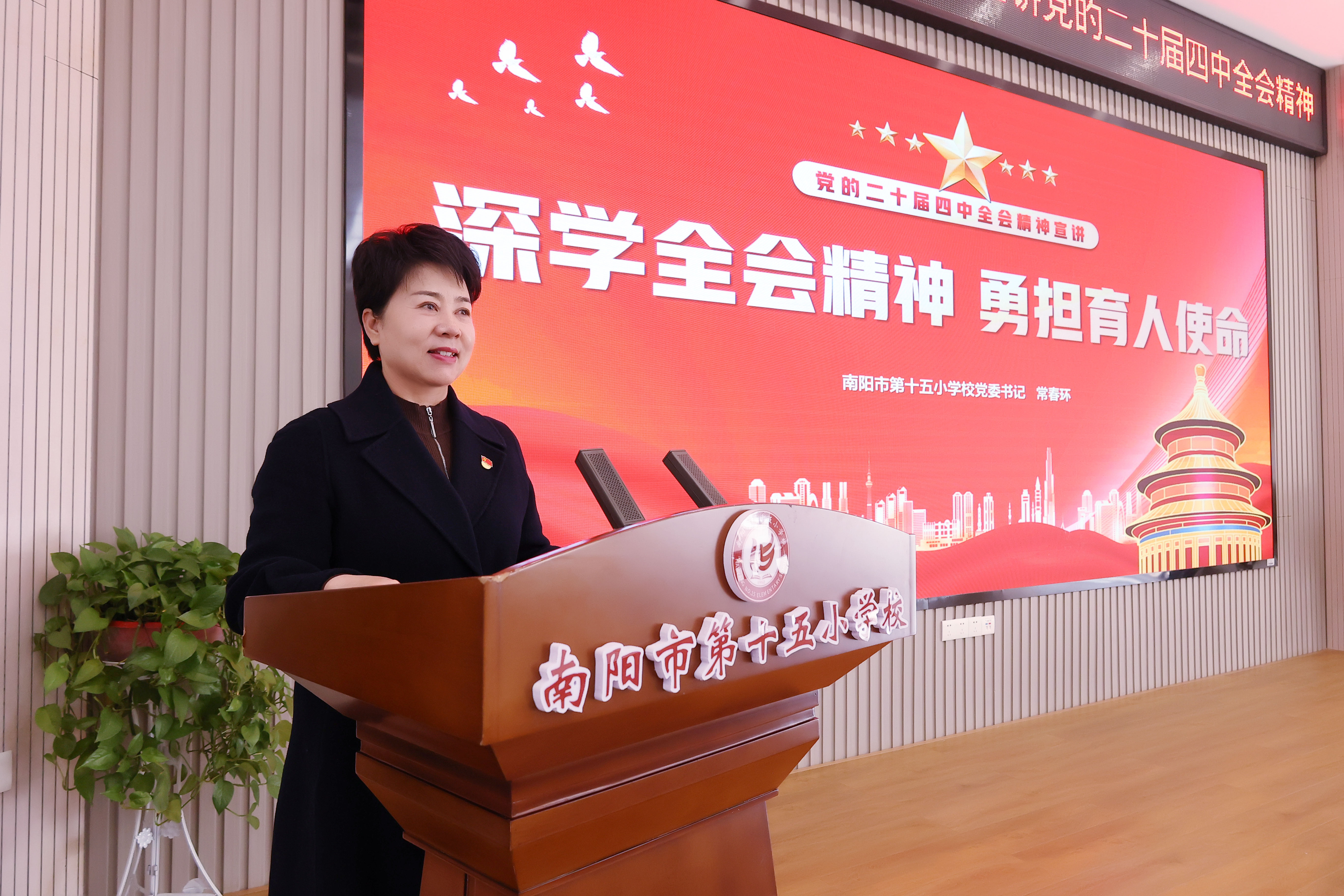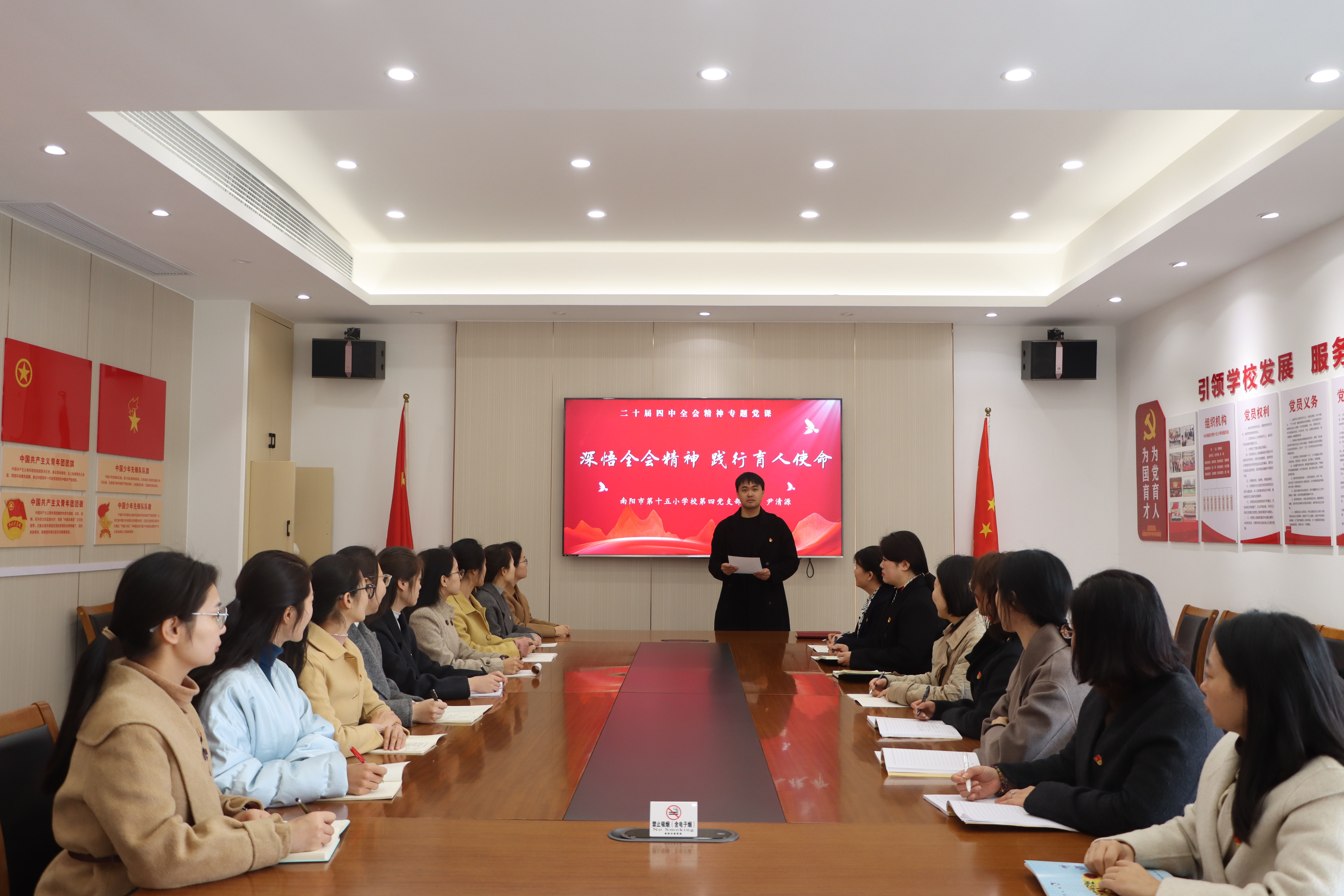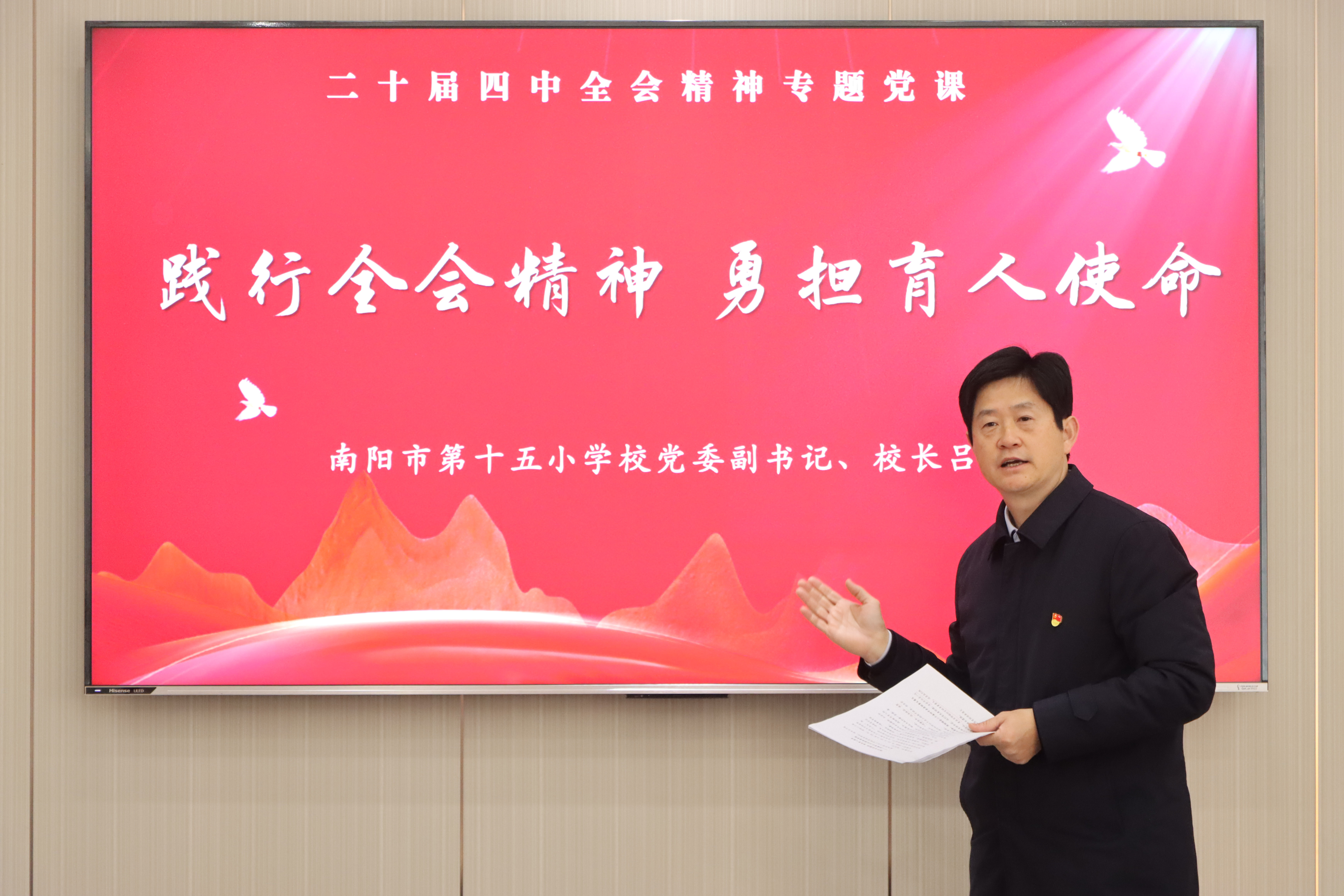 为深入学习党的二十届四中全会精神,加强教师思想政治建设,近日,我校组织全体教师开展系列专题宣讲活动,推动全会精神在教育教学一线落地生根。 学校党委书记、校长带头讲党课,围绕全会核心要义,结合基础教育实际,引导教师牢记“为党育人、为国育才”使命,落实立德树人根本任务。 学校邀请教师宣讲团成员、南阳市第十二小学校教科室副主任梁森作专题宣讲,结合河南教育发展与实践,解读全会精神,引导教师将中央部署转化为教育行动。 各党支部开展多样化学习,支部书记结合教育教学、班级管理等方面讲党课。党员教师围绕“课程思政”“提升教学能力”等开展研讨,明确实践路径。 活动中,教师们深受启发。大家纷纷谈到,将立足课堂实践,以学习成果赋能教学,提升师德素养与专业能力,做好学生的引路人。奋进新征程,诠释新担当。我校全体教师将从全会精神中汲取力量,以坚定的政治自觉、饱满的育人热情、扎实的教育行动,恪守初心、潜心育人,为培养栋梁之材筑牢坚实根基。