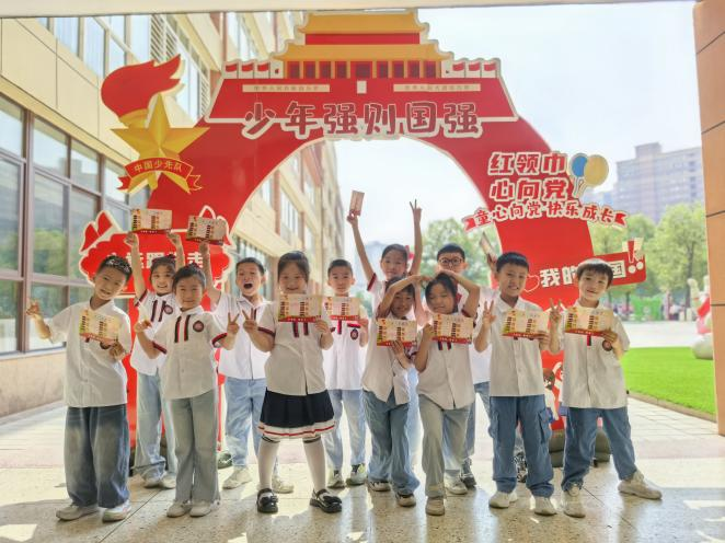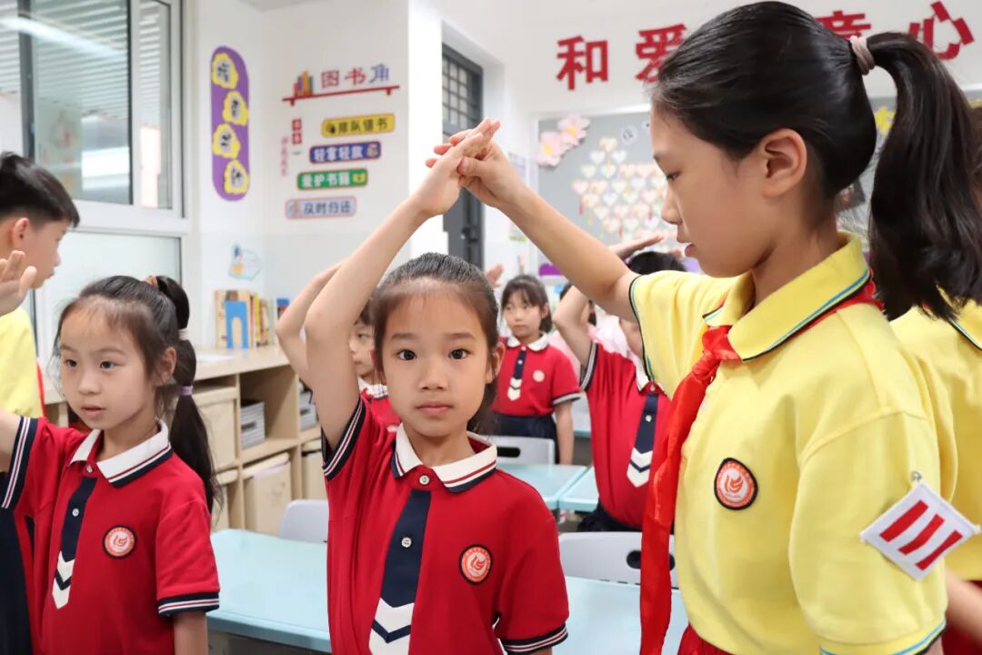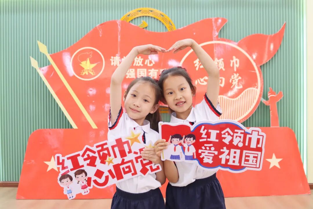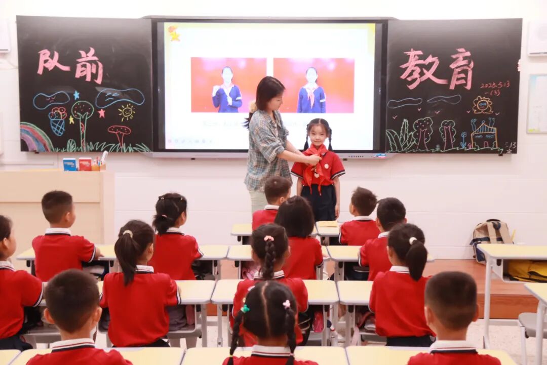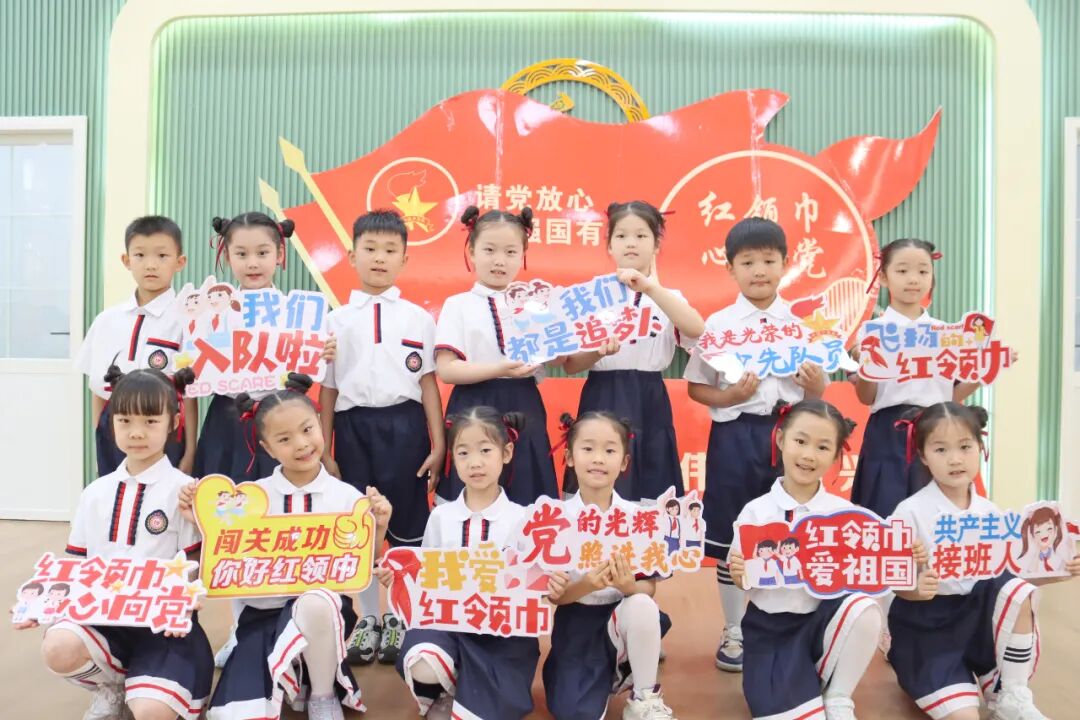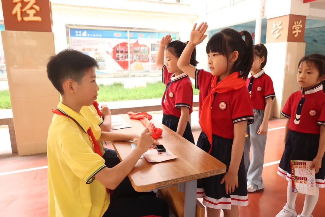 伴随着《中国少年先锋队队歌》的旋律,新队员用清澈的声音唱出对少先队的热爱与向往。 大队委宣读建队决定与新队员名单,他们正式成为少先队光荣一员。 校领导与老师为新队员系红领巾,小小身影挺得笔直,眼中闪烁自豪。这抹红是先烈的热血传承,是责任与光荣的象征。 在老师和大队长带领下,新队员举右拳庄严宣誓,这是承诺,更是成长路上的庄严起点。
