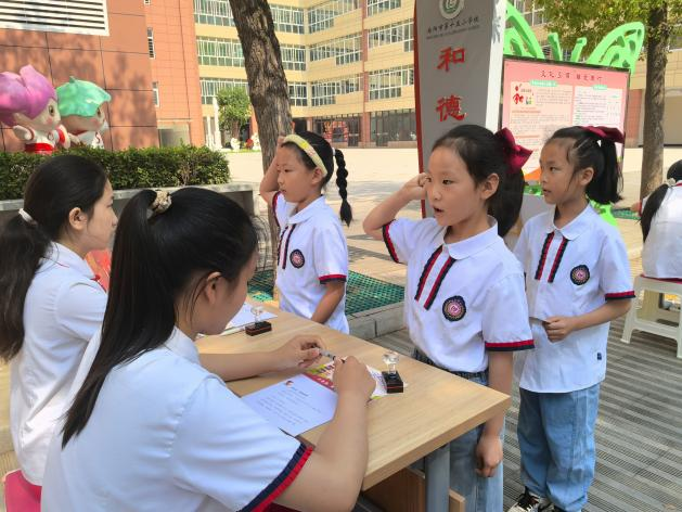 大队部举行现场入队考核,采用问答与实践形式。一年级同学持闯关卡,在小考官引导下完成敬队礼、系红领巾等环节展示,现场井然有序。