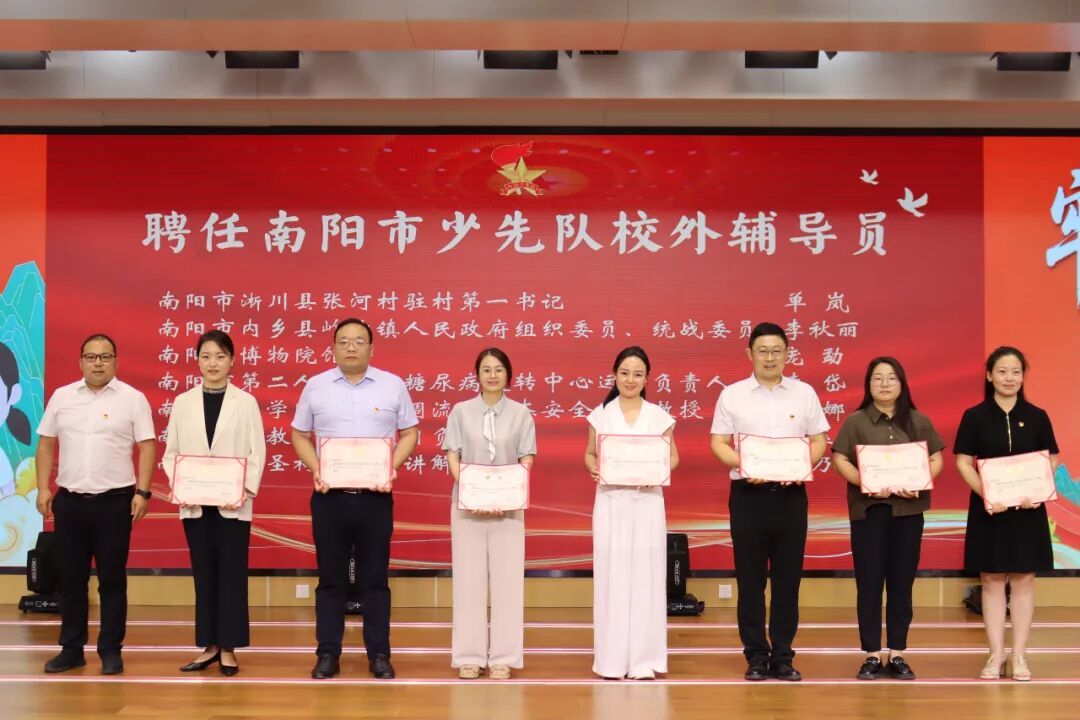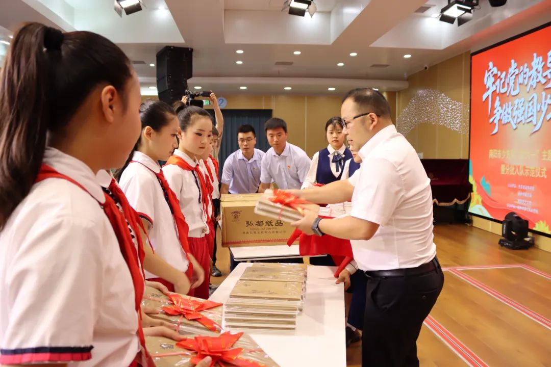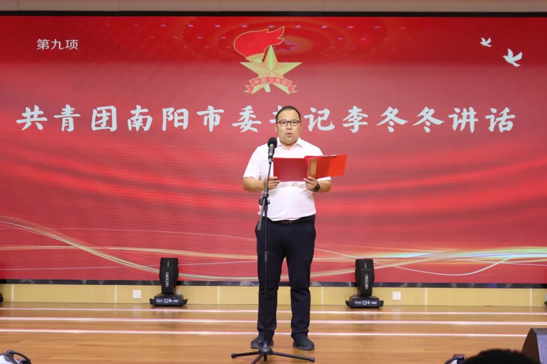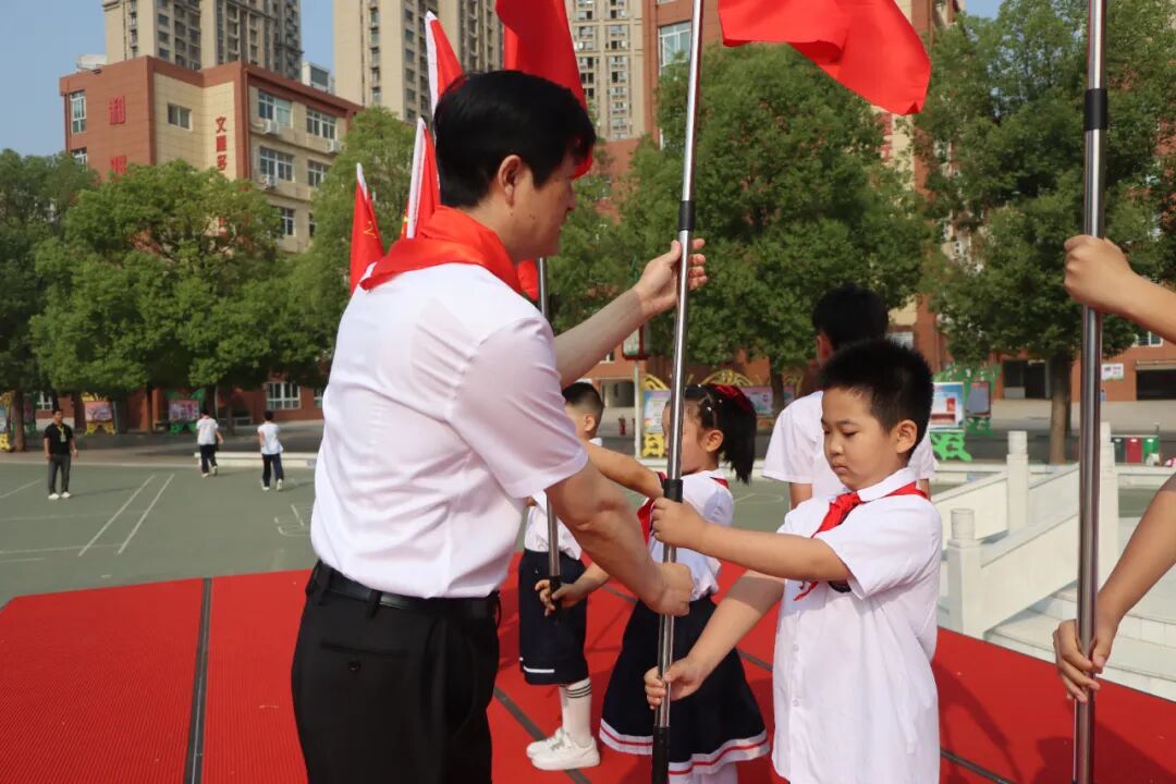 宣读辅导员名单后,队员代表敬献红领巾,各校区德育副校长颁发聘书,师生携手守护少年成长。 大队辅导员带领全体队员呼号“时刻准备着!”稚嫩声音汇聚成坚定誓言,回应党和祖国,担起未来责任。 共青团南阳市委书记李冬冬为新队员送学习用品,愿他们在知识海洋遨游,书写青春答卷。