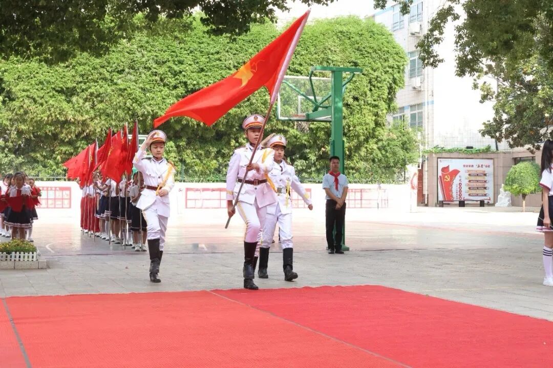 在激昂的《出旗曲》中,旗手迈着整齐的步伐入场,全体师生立正,新队员与辅导员庄严敬礼。