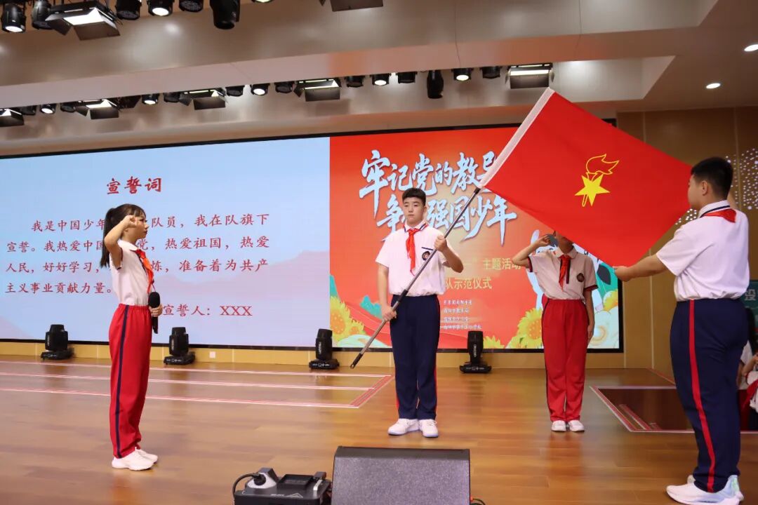 大队委为新建中队授旗,飘扬的旗帜凝聚集体荣誉,激励队员团结前行。