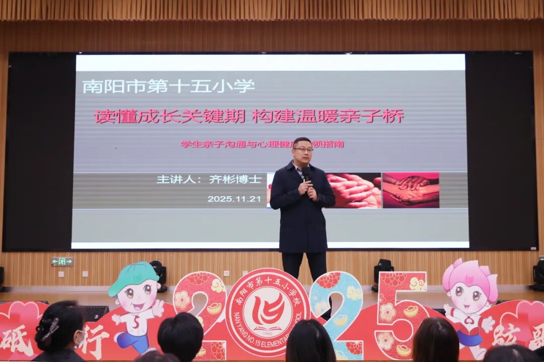 教育是一场爱与智慧的双向奔赴。为凝聚家校共育合力,助力学生健康成长,近日,南阳市第十五小学教育集团四校区同步举行家长学校系列活动。活动基于前期调研,特邀教育专家,聚焦中低年级家庭教育需求,为家长们带来了一场及时而实用的育人指南。 集团充分整合优质资源,特邀知名专家,结合调查问卷为中低年级家长定制专题讲座。现场座无虚席,学习氛围浓厚。七一路校区邀请香港中文大学教育心理学博士、吉林大学客座教授齐彬,作《读懂成长关键期,构建温暖亲子桥》主题分享。齐博士精准剖析三、四年级学生自我意识觉醒、情绪波动等心理特点,引导家长跳出“成人视角”,读懂行为背后的真实需求。